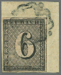 | Zusatzinformationen und Suchstichworte: | Rapp Auktion 2022 Auktionstermin: 2. - 7. Mai 2022 Los 25 Schweiz Kanton Zürich Type I vom 86. Bogenfeld mit Plattenfehler "schwarzer Untergrund links unten abgenutzt". Eine farbenfrische und fehlerfreie Marke mit schwarzer Rosette auf kleinem Briefstück. Attest Eichele, gez. Moser, Hunziker und Pfenninger. Zuschlag 420,00 CHF |
