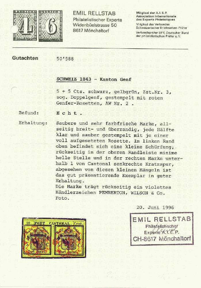 | Zusatzinformationen und Suchstichworte: | Rapp Auktion 2022 Auktionstermin: 2. - 7. Mai 2022 Los 27 Schweiz Kanton Genf Doppelgenf, sehr farbenfrisch, allseitig breit- bis überrandig geschnitten, jede Hälfte mit sauber ausgeprägten Rosetten. Trotz geringen Fehlern wie kleine Schürfung bzw. kleine helle Stelle und Kratzspur eine sehr gut präsentierende Marke, welche rückseitig ein violettes Händlerzeichen "PEMPERTON, WILSON & Co." trägt. Ausführliches Attest Rellstab. Zuschlag 5800,00 CHF |