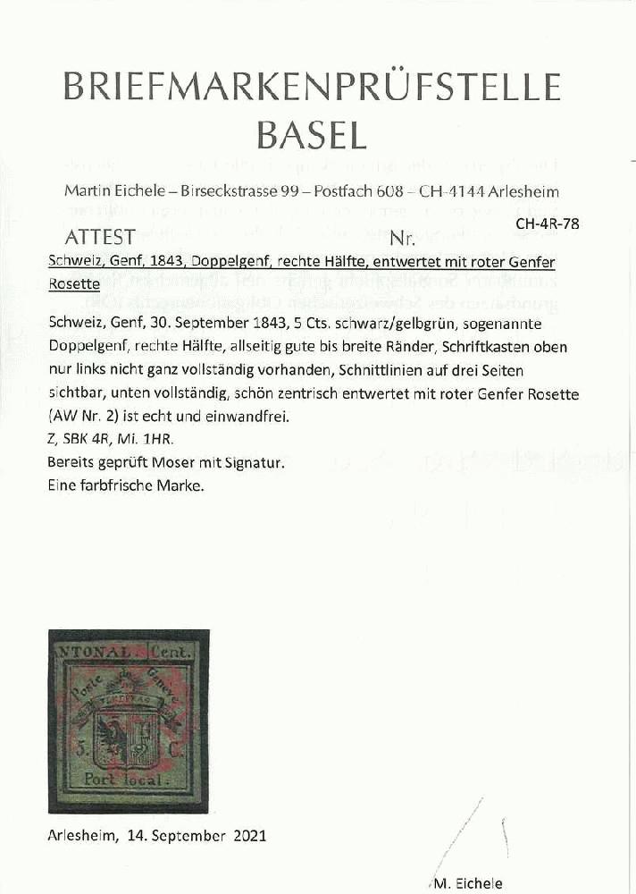 | Zusatzinformationen und Suchstichworte: | Rapp Auktion 2022 Auktionstermin: 2. - 7. Mai 2022 Los 38 Schweiz Kanton Genf Rechte Hälfte, sehr frisch und meist breitrandig, nur links oben an kurzer Stelle touchiert, zentrisch aufgesetzte Rosette und soweit tadellos erhalten. Signiert Moser, Atteste Weid und Eichele. Zuschlag 1.900,00 CHF |