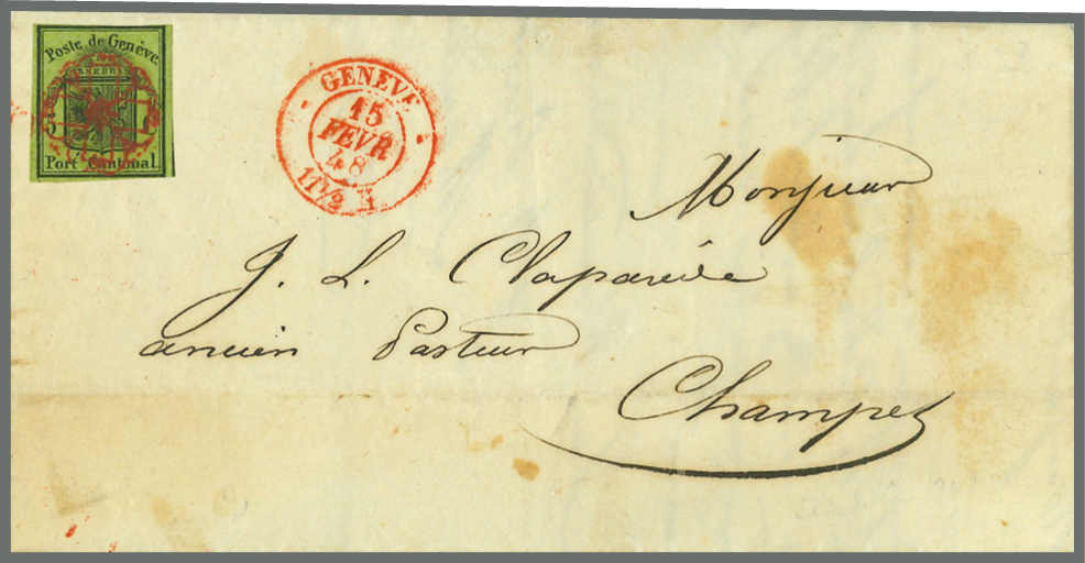 | Zusatzinformationen und Suchstichworte: | Rapp Auktion 2022 Auktionstermin: 2. - 7. Mai 2022 Los 45 Schweiz Kanton GenfIn leuchtend frischen Farben, oben entlang der Randlinie geschnitten, sonst gut bis überrandig mit zentrisch aufgesetzter Rosette, daneben Aufgabestempel GENEVE 15 FEVR 48 auf vollständigem, rechts leicht fleckigem Faltbrief nach Champez. Attest Rellstab, gez. Moser. Zuschlag 650,00 CHF |