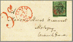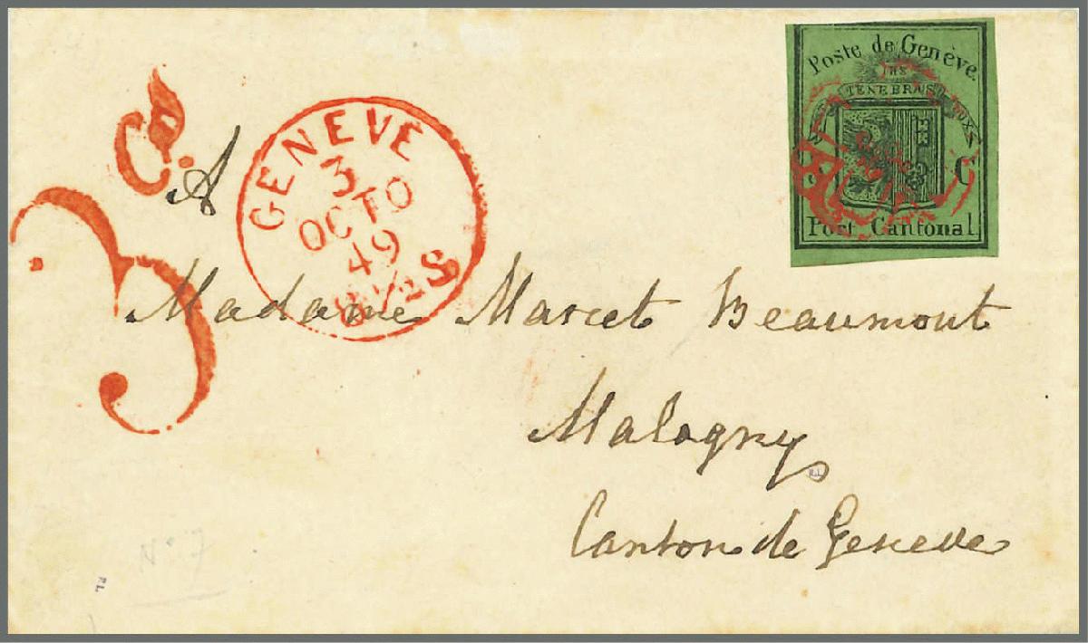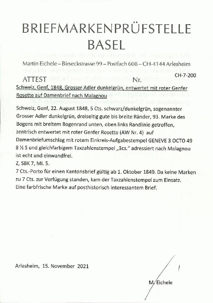 | Zusatzinformationen und Suchstichworte: | Rapp Auktion 2022 Auktionstermin: 2. - 7. Mai 2022 Los 49 Schweiz Kanton Genf 93. Marke des Bogens mit unterem Bogenrand, leuchtend frische Farben, meist breiter Schnitt, nur in der linken oberen Hälfte leicht getroffen, auf vollständigem Damenbriefchen-Umschlag mit Aufgabestempel GENEVE 3 OCTO 49 8 1/2 S und gleichfarbigem Taxzahlenstempel "3cs.". Das Porto betrug ab dem 1. Oktober 1849 im I. Rayon und in der 1. Gewichtsstufe 5 Rappen, was 7 Genfer Centimes entsprach. Weil aber die Adler-Marken für 4 Cent verkauft wurden, musste der Brief mit 3 cs. taxiert werden. Ein seltenes und äusserst attraktives Briefchen. Atteste Hunziker und Eichele. Zuschlag 10.000,00 CHF |