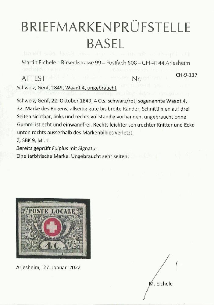 | Zusatzinformationen und Suchstichworte: | Rapp Auktion 2022 Auktionstermin: 2. - 7. Mai 2022 Los 63 Schweiz Kanton Genf Mit allseitig breiten Rändern, relativ kräftiger Schwarzdruck, ungebraucht ohne Gummierung. Der im Attest Fulpius erwähnte Teil-Originalgummi ist keum mehr wahrnehmbar. Die Marke weist rechts eine sehr leichte senkrechte Knitter- spur auf, die rechte untere Ecke, ausserhalb des Markenbildes ist etwas fehlerhaft. Ungebraucht ist diese Marke äusserst selten, die minimen Einschränkungen dürfen auch von qualitätsbewussten Sammlern in Kauf genommen werden. Zuschlag 13.000,00 CHF |