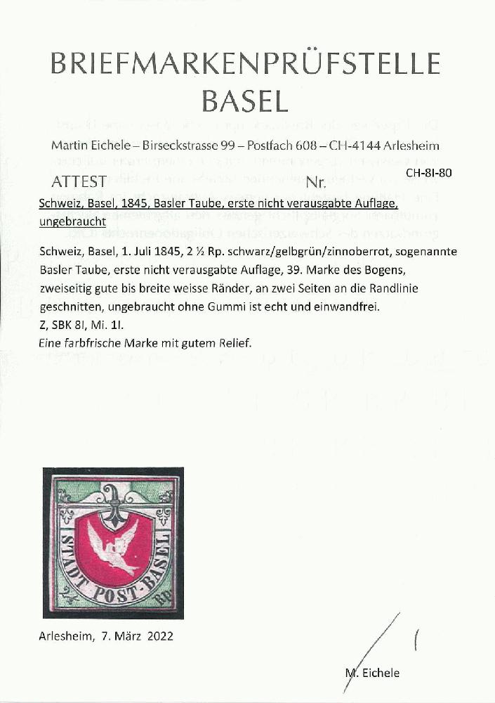 | Zusatzinformationen und Suchstichworte: | Rapp Auktion 2022 Auktionstermin: 2. - 7. Mai 2022 Los 52 Schweiz Kanton Basel In leuchtend frischen Farben mit gutem Relief, weisse Ränder an 2 Seiten, ungebraucht ohne Gummierung. Eine schöne und fehlerfrei erhaltene Marke. Attest Eichele. Zuschlag 2.400,00 CHF |
