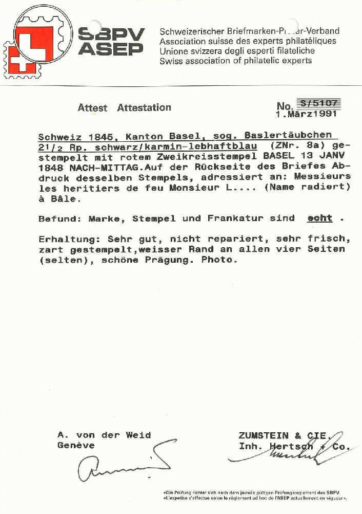 | Prüfer: | von der Weid, Alain (SBPV / ASEP (Schweizerischer Briefmarken-Prüfer-Verband)) |