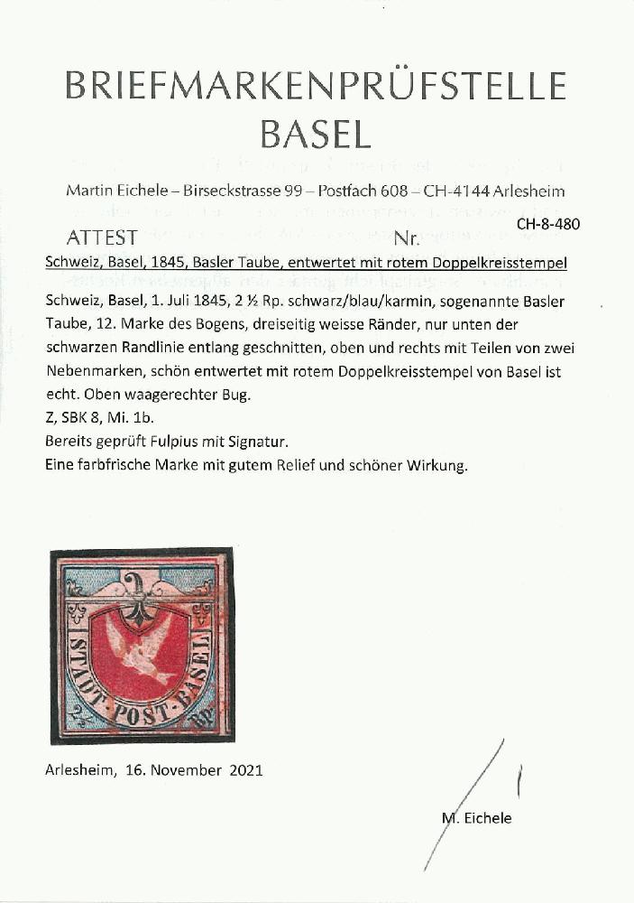 | Zusatzinformationen und Suchstichworte: | Rapp Auktion 2022 Auktionstermin: 2. - 7. Mai 2022 Los 60 Schweiz Kanton Basel 12. Marke des Bogens, sehr frisch mit gutem Relief, weisse Ränder an 3 Seiten, oben und rechts mit Teilen der Nebenmarken, nur unten ist die Marke entlang der Randlinie geschnitten. Trotz eines waagrechten Buges präsentiert diese Taube sehr gut. Attest Eichele. Zuschlag 3.200,00 CHF |