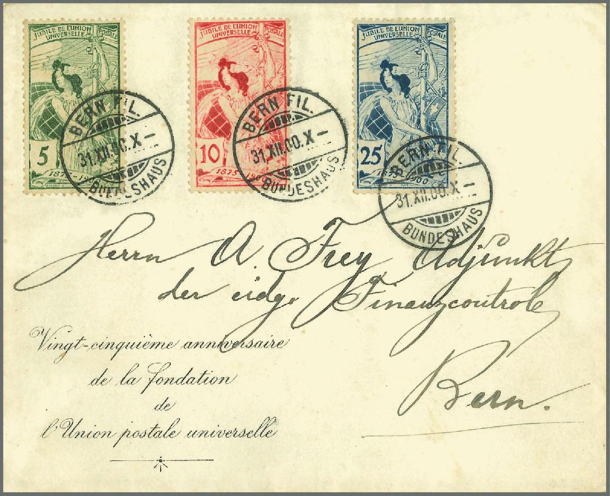 | Zusatzinformationen und Suchstichworte: | Rapp Auktion 2022 Auktionstermin: 2. - 7. Mai 2022 Los 246 Int. Organisationen, UPU 25 Jahre UPU, der kpl. Satz von den nachgravierten Platten, einzeln auf Sonderumschlag zum Jubiläum 25 Jahre Weltpostverein. Alle 3 Marken tadellos gezähnt und sehr sauber gestempelt BERN FIL. BUNDESHAUS 31.XII.00.X. Absender des Briefes war der damalige Bundespräsident Walter Hauser! Attest Eichele, signiert Hunziker. Zuschlag 8.500,00 CH |