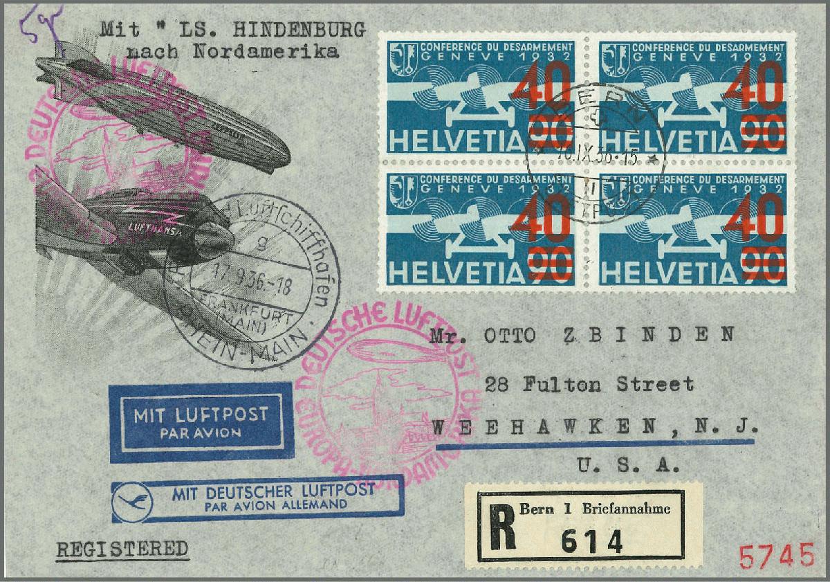 | Zusatzinformationen und Suchstichworte: | Rapp Auktion 2022 Auktionstermin: 2. - 7. Mai 2022 Los 515 Zeppelin, Zeppelinpost LZ129, Nordamerikafahrten 40 auf 90 Rp. blau, hellroter Aufdruck, tadelloser Viererblock mit Zentrums-Stempel BERN 16.IX.36, befördert mit Luftschiff "LS HINDENBURG" mit entsprechenden Sonderstempel auf schönem Brief nach den USA. Ein attraktiver und sehr gut erhaltener Brief. Attest Rellstab. Zuschlag 1.300,00 CHF |