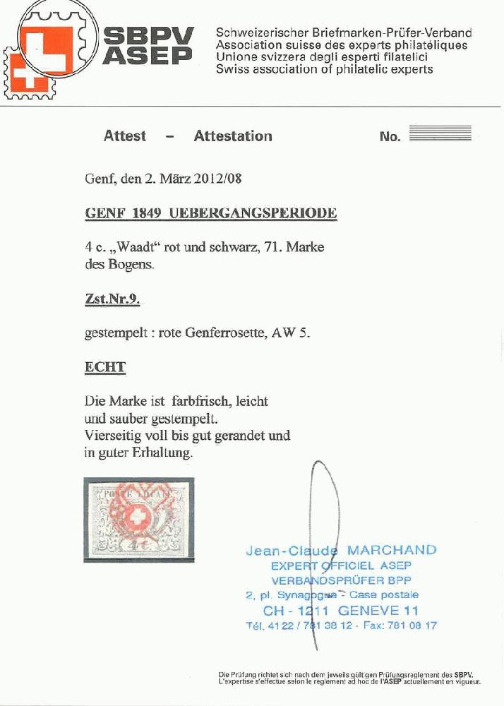 | Prüfer: | Marchand, Jean-Claude (SBPV / ASEP (Schweizerischer Briefmarken-Prüfer-Verband)) |