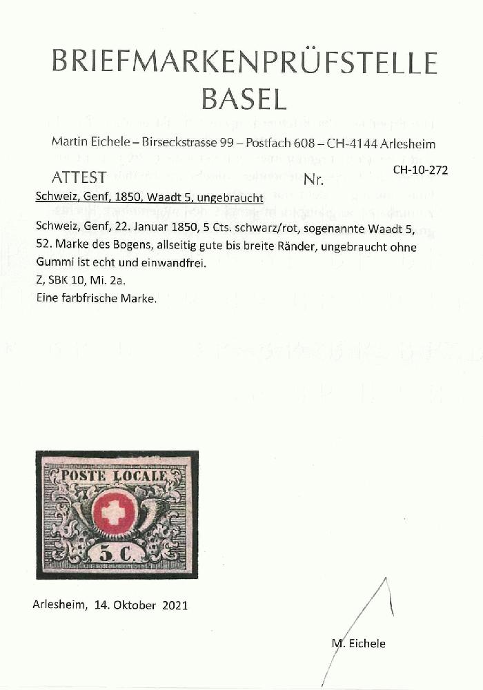 | Zusatzinformationen und Suchstichworte: | Rapp Auktion 2022 Auktionstermin: 2. - 7. Mai 2022 Los 67 Schweiz Übergangszeit, Waadt, Neuenburg, Winterthur 52. Marke des Bogens, ungebraucht ohne Gummi. Die Marke ist frisch, an 3 Seiten breitrandig und ohne Fehler. Atteste Hunziker und Eichele. Zuschlag 750,00 CHF |