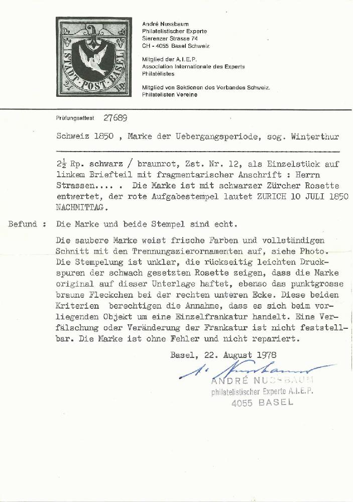 | Prüfer: | Nussbaum, André (SBPV / ASEP (Schweizerischer Briefmarken-Prüfer-Verband)) |