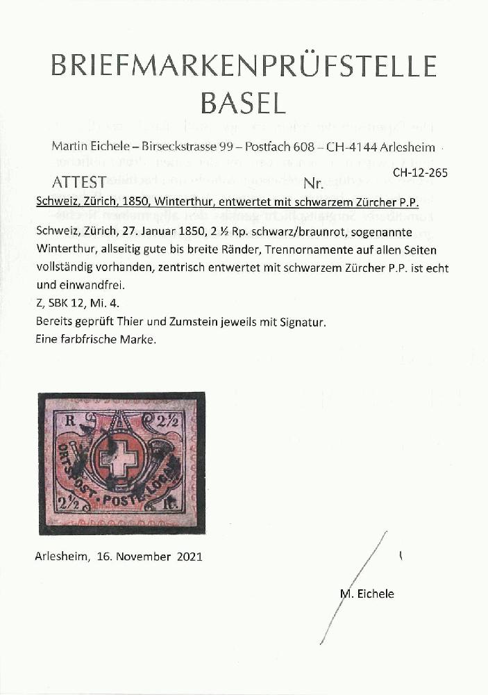 | Zusatzinformationen und Suchstichworte: | Rapp Auktion 2022 Auktionstermin: 2. - 7. Mai 2022 Los 83 Schweiz Übergangszeit, Waadt, Neuenburg, Winterthur Frisch und breitrandig mit Trennornamenten an allen Seiten, leichtes schwarzes P.P. aus dem Postkreis Zürich und in fehlerfreier Erhaltung. Attest Eichele. Zuschlag 2.600,00 CHF |