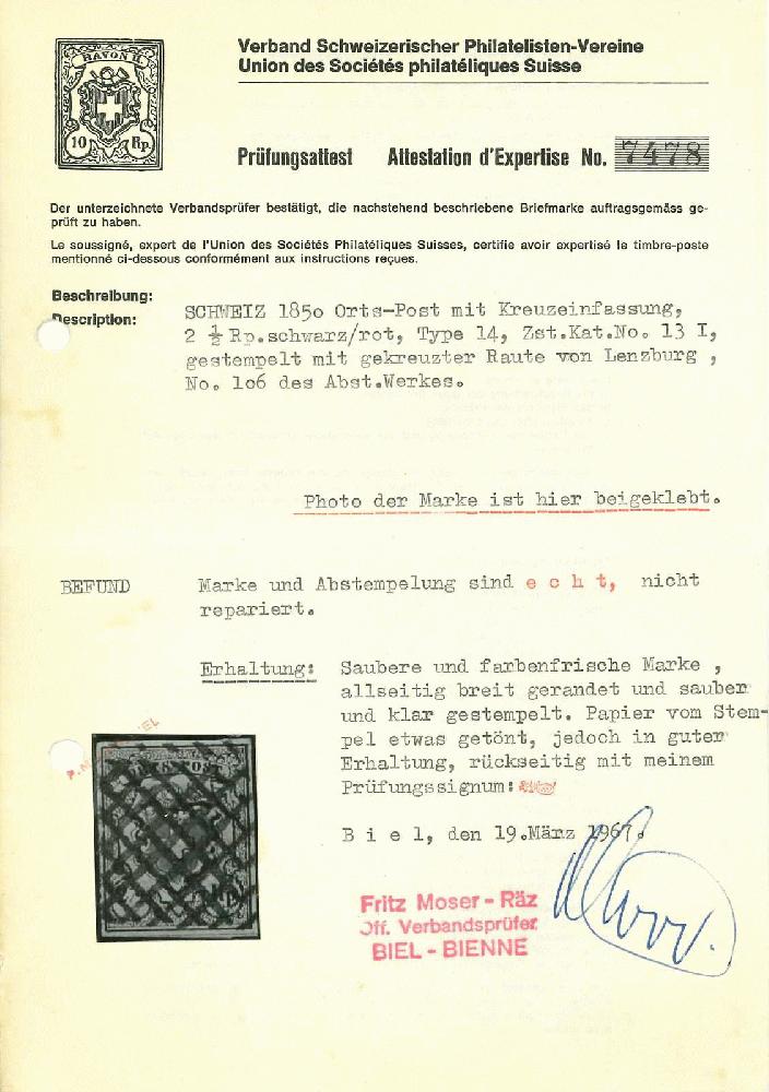 | Prüfer: | Moser-Räz, Fritz (SBPV / ASEP (Schweizerischer Briefmarken-Prüfer-Verband)) |
