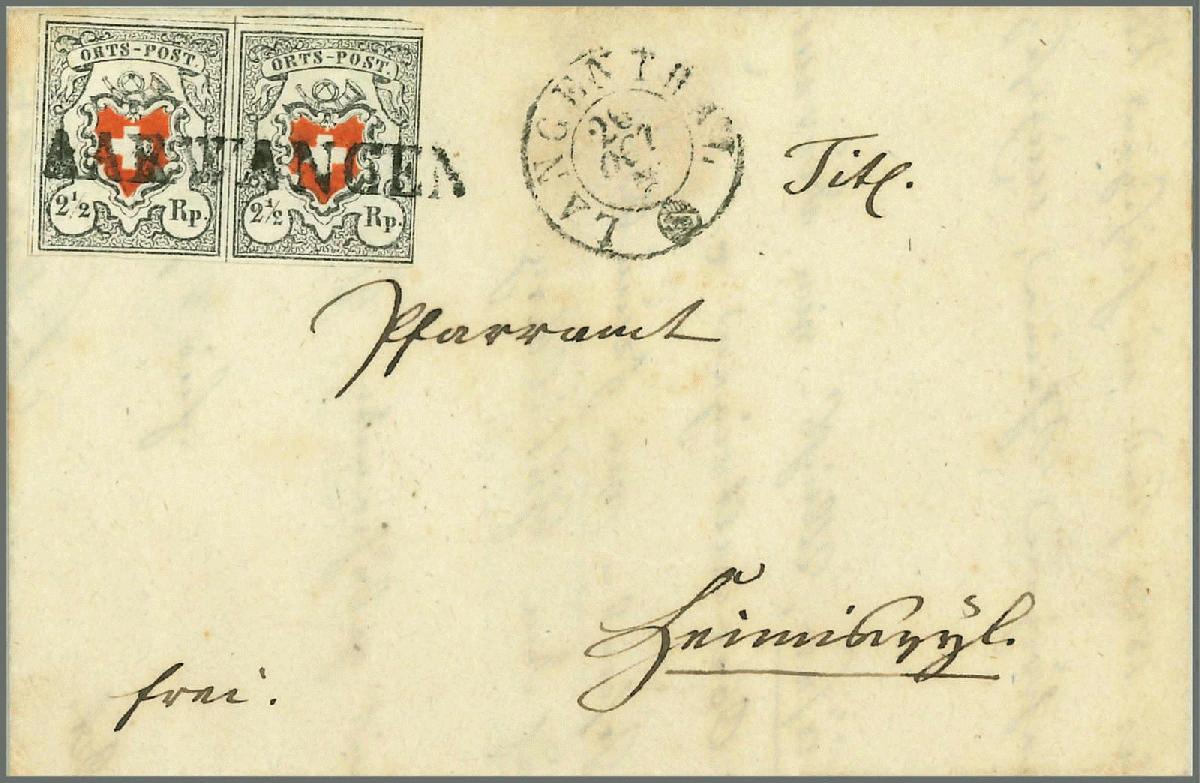 | Zusatzinformationen und Suchstichworte: | Rapp Auktion 2022 Auktionstermin: 2. - 7. Mai 2022 Los 95 Schweiz Ortspost Waagrechtes Paar mit den Typen 11+12, frisch und breitrandig, nur rechts an die Randlinie geschnitten, mit schön ausgeprägtem Stabstempel AARWANGEN (AW 884) auf vollständigem Faltbrief über Langenthal, Burgdorf nach Heimiswyl. In der rechten Marke befindet sich eine leichte senkrechte Falte, welche bereits vor dem Aufkleben des Paares bestanden hat. Ein schöner Brief aus dem ersten Verwendungsmonat dieser Marke. Attest Eichele Zuschlag 2.600,00 CHF |