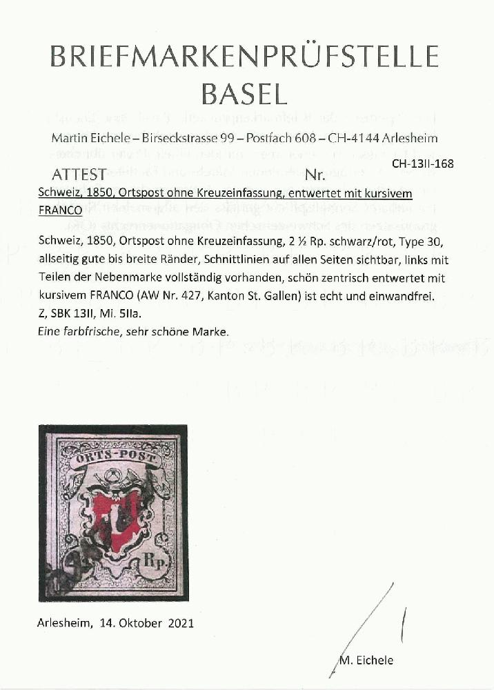 | Zusatzinformationen und Suchstichworte: | Rapp Auktion 2022 Auktionstermin: 2. - 7. Mai 2022 Los 96 Schweiz Ortspost Type 30, breit- bis überrandig mit Teilen der linken Nebenmarke, frisch und fehlerfrei mit kursivem FRANCO (AW 427) aus dem Kanton St. Gallen. Atteste Renggli und Eichele. Zuschlag 800,00 CHF |