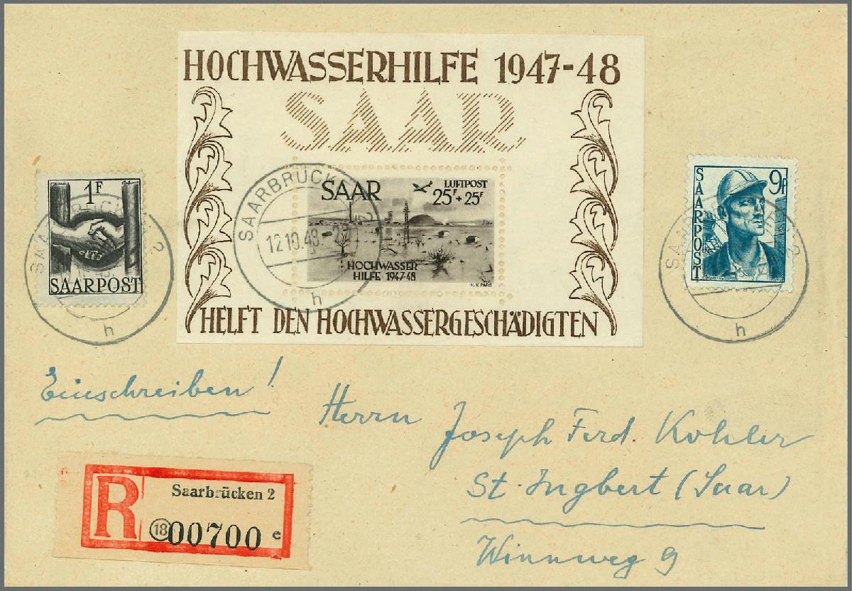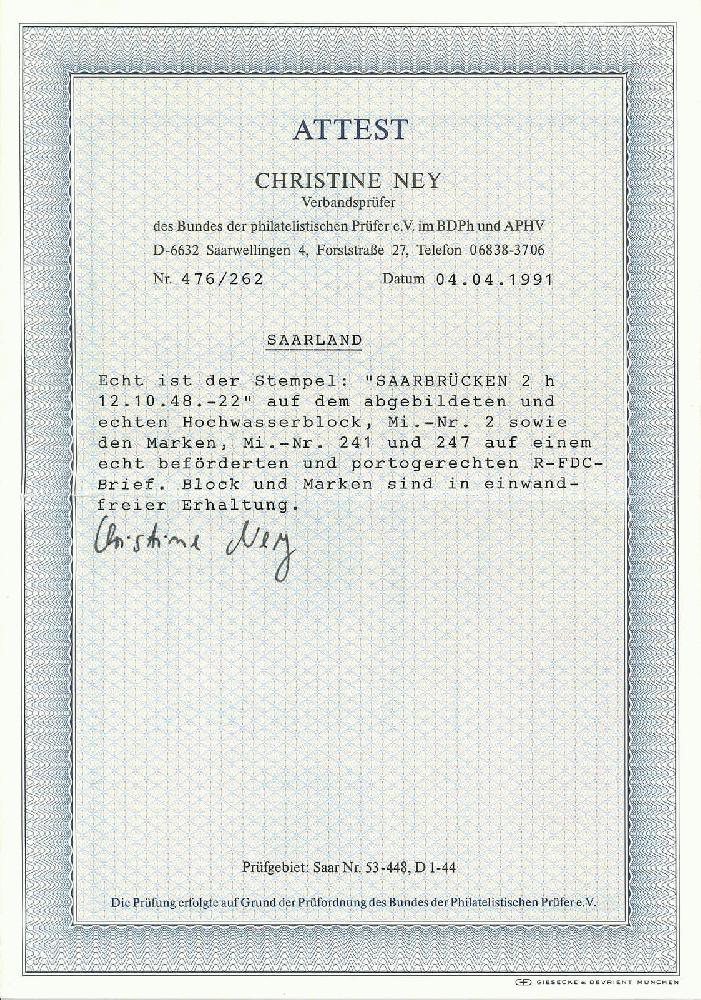 | Zusatzinformationen und Suchstichworte: | Rapp Auktion 2022 Auktionstermin: 2. - 7. Mai 2022 Los 970 Saargebiet Hochwasser-Block, zusammen mit Beifrankatur und Ersttag-Stempel SAARBRÜCHEN 12.10.48, portogerecht auf Einschreibe-Brief nach St. Ingbert. Seltener und tadellos erhaltener FDC. Attest Ney. Zuschlag 1.300,00 CHF |