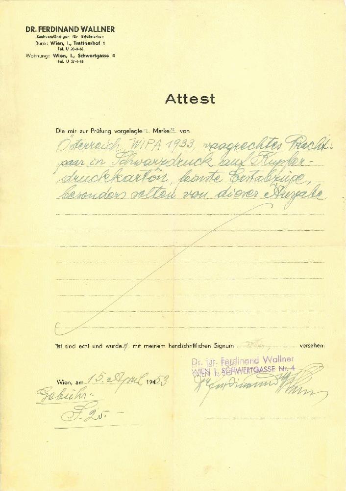 | Zusatzinformationen und Suchstichworte: | Rapp Auktion 2022 Auktionstermin: 2. - 7. Mai 2022 Los 1013 Österreich Wipa-Marke, Schwarzdruck auf ungummiertem Karton-Papier im waagrechten Paar. Tadellos und selten. Altes Attest Wallner. Zuschlag 1.400,00 CHF |