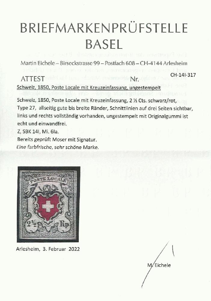 | Zusatzinformationen und Suchstichworte: | Rapp Auktion 2022 Auktionstermin: 2. - 7. Mai 2022 Los 104 Schweiz Ortspost Type 27, ungebraucht mit Original-Gummi, kräftiger Schwarzdruck, gute Ränder und beste Erhaltung. Attest Eichele, signiert Moser. Zuschlag 2.500,00 CHF |