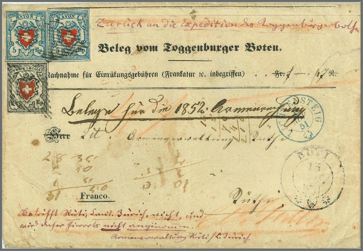 | Zusatzinformationen und Suchstichworte: | Rapp Auktion 2022 Auktionstermin: 2. - 7. Mai 2022 Los 108 Schweiz Ortspost Type 10, zusammen mit 2 Exemplaren Rayon I hellblau vom Druckstein B3 (linke Marke leicht mangelhaft) auf vollständigem Nachnahme-Umschlag von LICHTENSTEIG 11 NOV 51 nach Rüthi (SG), fehlgeleitet nach Rüti (ZH) und zurück, da nicht Rüti betreffend. Diese 12 1/2 Rp.-Frankatur-Kombination ist äusserst selten, gemäss R. Schäfer sind 8 solche Frankaturen registriert. Der Umschlag ist rechts eingerissen, verschrieben bzw. unsauber, die Frankatur selbst ansprechend gut erhalten. Attest Eichele. Der SBK notiert diese Frankatur mit 40'000.-. Zuschlag 1.300,00 CHF |