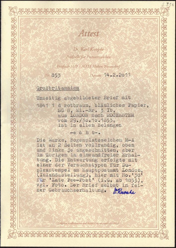 | Zusatzinformationen und Suchstichworte: | 108. Briefmarken Lenz Auktion Auktionstermin: 29. April - 5. Mai 2022 Los 304 Grossbritannien 1841, 1 P., 2-seitig leicht angeschitten, klarer Duplex-Versuchs-Stpl. "38-OCT.29-53", kleiner Prachtbtrief, rs. AKST, Attest Dr. Knopke, sehr selten! Zuschlag 60,00 EUR |