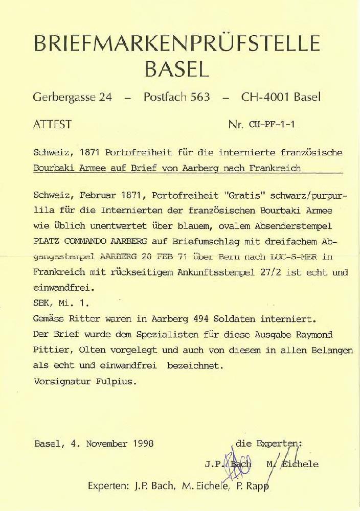 | Prüfgebiet: | Schweiz - Portofreiheitsmarken |