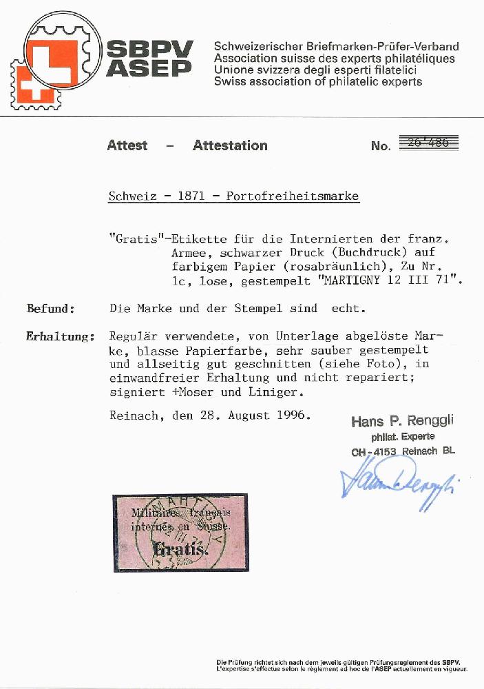 | Prüfgebiet: | Schweiz - Portofreiheitsmarken |