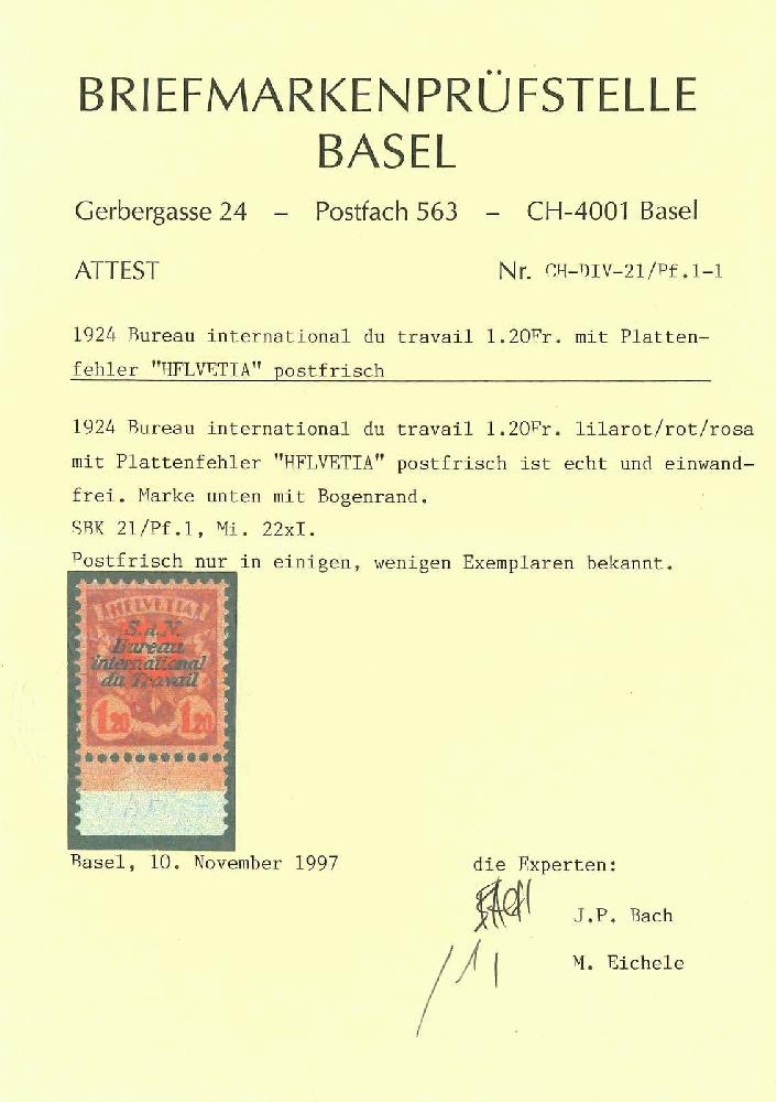 | Zusatzinformationen und Suchstichworte: | Rapp Auktion 2022 Auktionstermin: 2. - 7. Mai 2022 Los 678 Schweiz Internationale Arbeitsamt BIT Fr. 1.20 rot, Plattenfehler "HFLVETIA", tadellos postfrisch mit unterem Bogenrand. Atteste Eichele und BP. Von dieser äusserst seltenen Abart im postfrischen Zustand dürften lediglich einige Exemplare bekannt sein! Zuschlag 7.000,00 CHF |