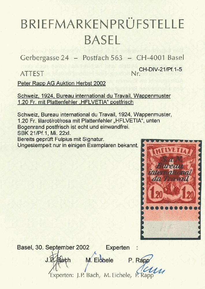 | Zusatzinformationen und Suchstichworte: | Rapp Auktion 2022 Auktionstermin: 2. - 7. Mai 2022 Los 678 Schweiz Internationale Arbeitsamt BIT Fr. 1.20 rot, Plattenfehler "HFLVETIA", tadellos postfrisch mit unterem Bogenrand. Atteste Eichele und BP. Von dieser äusserst seltenen Abart im postfrischen Zustand dürften lediglich einige Exemplare bekannt sein! Zuschlag 7.000,00 CHF |