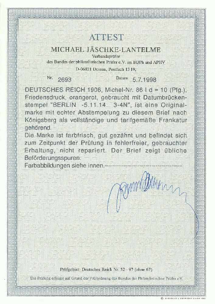 | Prüfer: | Jäschke-Lantelme, Michael (BPP (Bund Philatelistischer Prüfer)) |