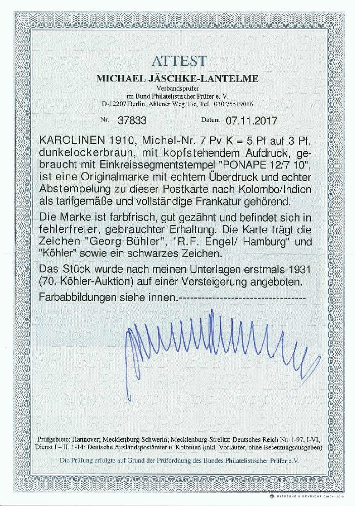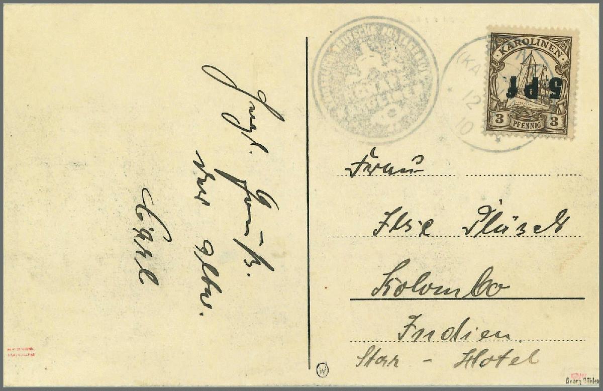 | Zusatzinformationen und Suchstichworte: | Rapp Auktion 2022 Auktionstermin: 2. - 7. Mai 2022 Los 965 Deutsche Kolonien Karolinen PONAPE-Provisorium, Aufdruck kopfstehend, tadellos erhalten auf Bildpost- karte (Ponape) nach Kolombo in Indien. Eine ungewöhnliche Destination! Attest Jäschke-L. Zuschlag 2.600,00 CHF |