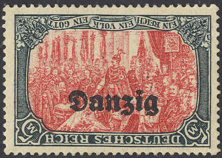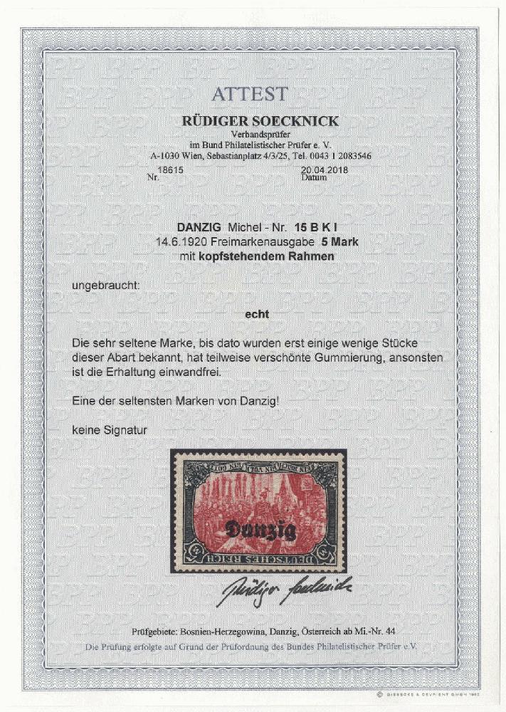 | Zusatzinformationen und Suchstichworte: | 70. Deider Auktion Auktionstermin: 18.-21. Mai 2022 Los 3170 Danzig 1920, 5 Mark "Reichsgründungsgedenkfeier" grünschwarz/lilarot, 25:17 Zähnungslöcher, kopfstehender Rahmen, ungebraucht mit verbesserter Gummierung, in einwandfreier Erhaltung, Fotoattest Soecknick BPP "eine der seltensten Marken von Danzig". Ausruf 8.000,00 EUR |