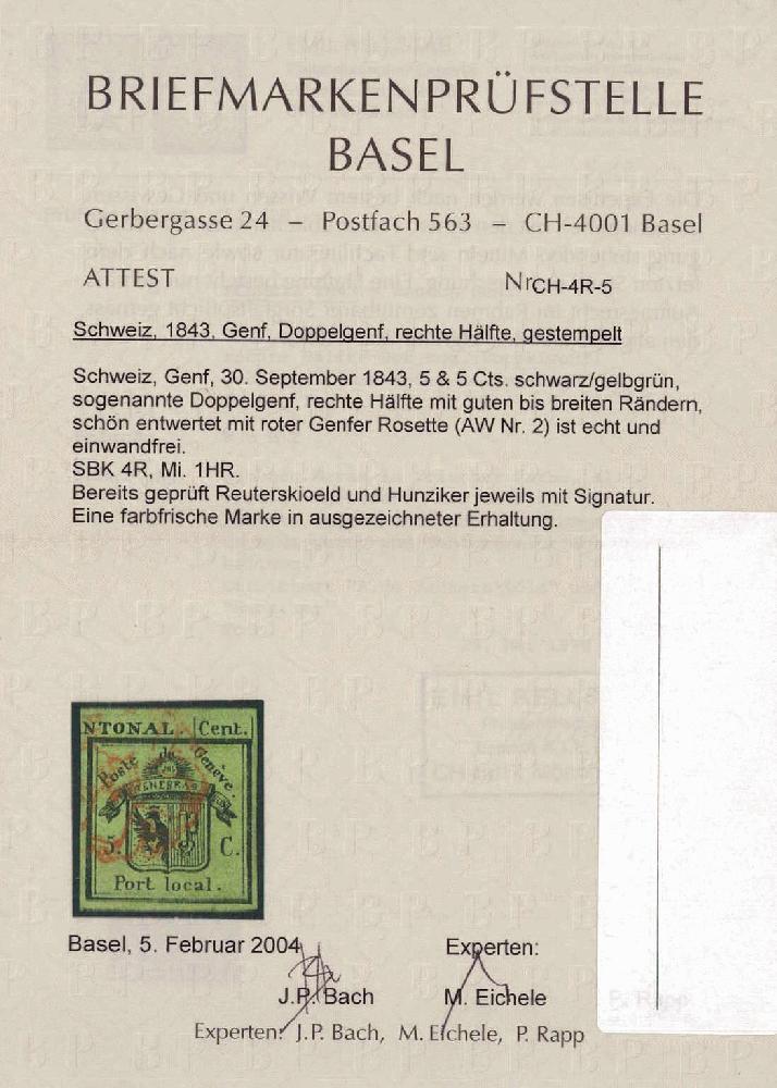 | Zusatzinformationen und Suchstichworte: | 40. Jean-Paul Bach Auktion Auktionstermin: 11. Juni 2022 Los 106 Schweiz Kanton Genf Sehr farbfrisch, allseitig vollrandig, saubere GENFER-Rosette (AW Nr. 2), hervorragende, fehlerfreie Erhaltung. Sign. A. de Reuterskiöld, H. Hunziker und Atteste Rellstab und Eichele. Ausruf 6.400,00 CH |