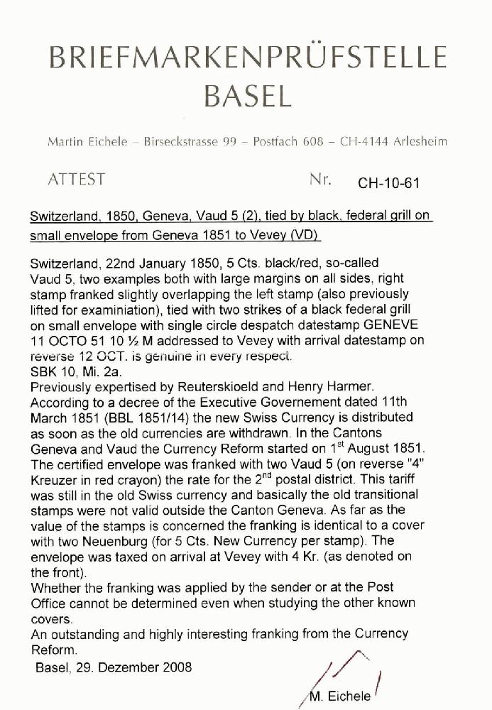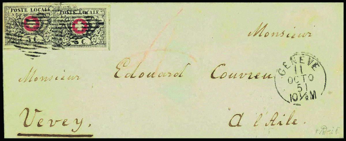 | Zusatzinformationen und Suchstichworte: | 40. Jean-Paul Bach Auktion Auktionstermin: 11. Juni 2022 Los 160 Schweiz Kanton Genf Waadt 5, 2 farbfrische Einzelmarken, mit sauberen eidg. Rauten auf den schönen Brief übergehend, sauberer Aufgabestempel GENEVE 11 OCTO 51, nach VEVEY adressiert, rückseitiger Ankunftsstempel. Gemäss Verordnung des Bundesrates vom 11. März 1851, tritt mit Beginn des Einlösungstermins für die neue Währung der neue schweiz. Münzfuss in Kraft. Die Einlösung begann in den Kantonen GENF und WAADT am 1. August 1851. Dieser Brief wurde mit zwei Waadt 5 frankiert (rückseitig rote "4"-Kreuzer) was den Tarif für dem 2. Briefkreis entsprach. Dieser Tarif war jedoch noch in aller eidgenössischer Währung und die alten Kantonsmarken waren eigentlich nicht gültig, ausserhalb des Kantons GENF. Wertmässig entsprach die Frankatur einem Brief frankiert mit zwei NEUENBURG (zu 5 Cts. neue Währung). Dennoch in VEVEY austaxiert mit 4 Kr. (vorderseitig ausgewiesen). Ob die Frankatur in dieser Art vom Absender vorgenommen wurde, oder durch die Post lässt sich auch aus anderen bekannten Briefen nicht ableiten. Eine ausserordentlich seltene und interessante Frankatur aus der Umtauschzeit. Der Brief wurde bei Marken-Müller 1943 angeboten. Sign. Reuterskiöld und Henry Harmer. Attest Eichele. Ausruf 80.000,00 CHF |