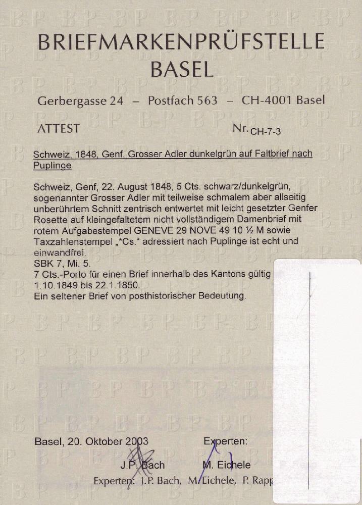 | Zusatzinformationen und Suchstichworte: | 40. Jean-Paul Bach Auktion Auktionstermin: 11. Juni 2022 Los 130 Schweiz Kanton Genf Farbfrisch und mit teilweise schmalem, aber allseitig unberührtem Schnitt, leicht aufgesetzte GENFER-Rosette, auf klein gefaltetem, nicht ganz vollständigem Damenbriefchen, roter Aufgabe-Stempel GENEVE 29 NOVE 49 10 1/2, dazu der seltene Taxzahl-Stempel "3 Cs.", adressiert nach PUPLINGE. Soweit in guter Erhaltung. Ein sehr seltener Brief von historischer Bedeutung. Attest Eichele. Ausruf 25.000,00 CHF |