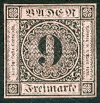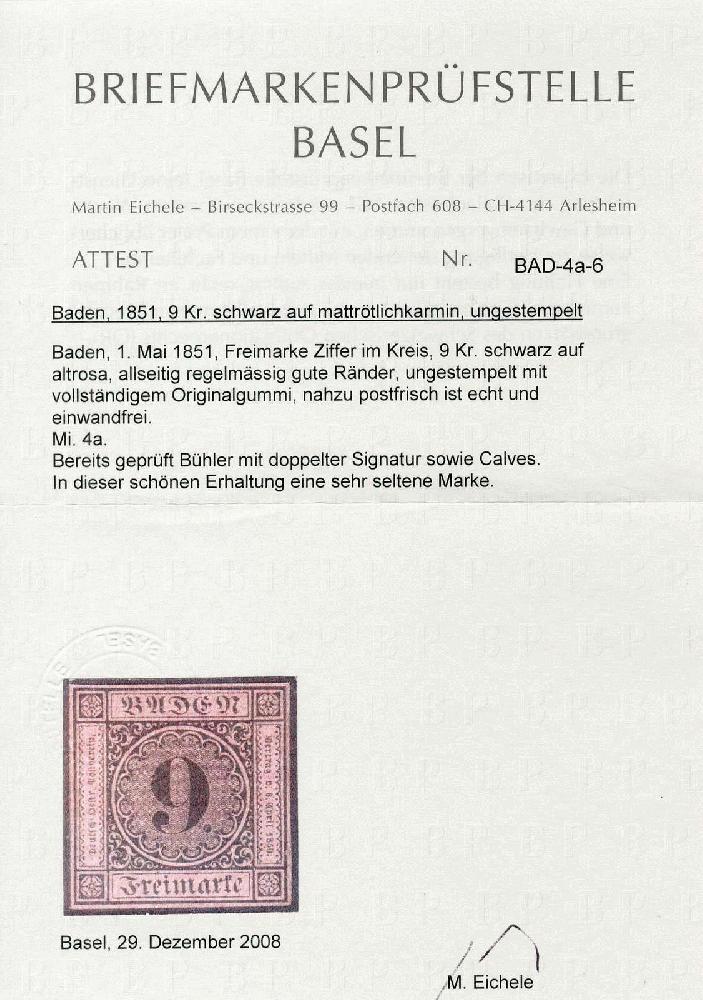| Zusatzinformationen und Suchstichworte: | 117. Veuskens Auktion Auktionstermin: 1. - 2. Juli 2022 Los 1045 Altdeutschland Baden 9 Kr. Freimarke 'Ziffer im Kreis' 1851, in a.-Farbe schwarzmattrötlichkarmin (altrosa), die Marke ist ungest., mit vollständigem Originalgummi (!), nahezu postfrisch. Allseits regelmäßig gute Ränder, farbfrisch. Sig. Bühler und doppelte Signatur Calves sowie Attest der Briefmarkenprüfstelle Basel. In dieser Qualität selten am Markt. M€ 5.500,-- +++ Zuschlag 3.150,00 EUR |