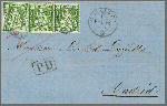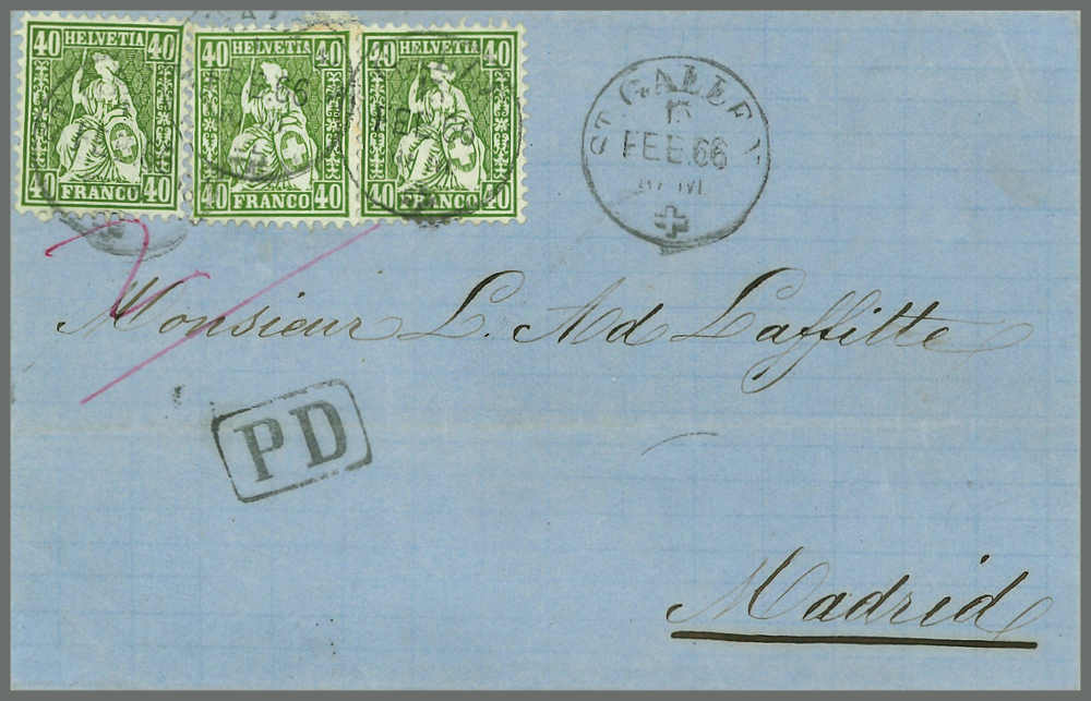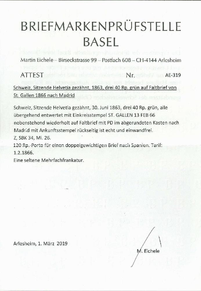 | Zusatzinformationen und Suchstichworte: | Rapp Auktion 2022 Auktionstermin: 2. - 7. Mai 2022 Los 236 Schweiz Sitzende Helvetia gezähnt 3 Exemplare 40 Rp. grün, als portogerechte Frankatur auf doppelgewichtigem Brief mit Aufgabestempel ST. GALLEN 13 FEB 66 nach Madrid. Rückseitig Transitstempel BASEL und AK-Stempel MADRID 19 FEB 66. Gut erhaltene Mehrfach-Frankatur. Attest Eichele. Zuschlag 200,00 CHF |