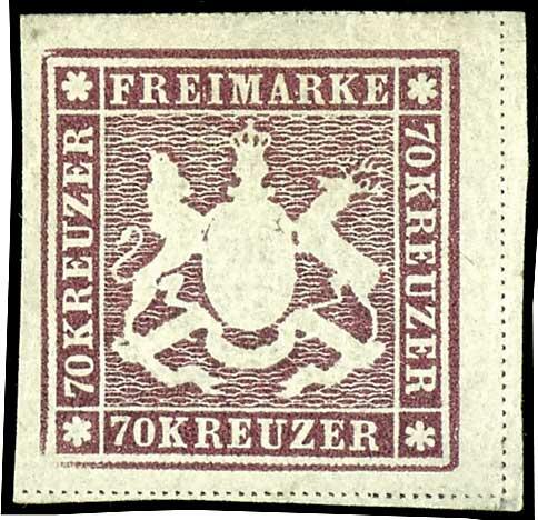 | Zusatzinformationen und Suchstichworte: | Dr. Reinhard Fischer 187. Auktion Auktionstermin: 15. Juli 2022 Los 1347 Altdeutschland Württemberg 70 Kr. braunlila, allseits breitrandig mit zwei vollen Trennungslinien, Bogenfeld 6, tadellos ungebraucht mit Originalgummierung und nur kleinen Anhaftstellen, gepr. Hederer mit Attest, Georg Bühler und Fotoattest Klinkhammer BPP (2022), Mi. 3.800.- - eine sehr seltene Marke in tadelloser Qualität! Ausruf 800,00 EUR |
