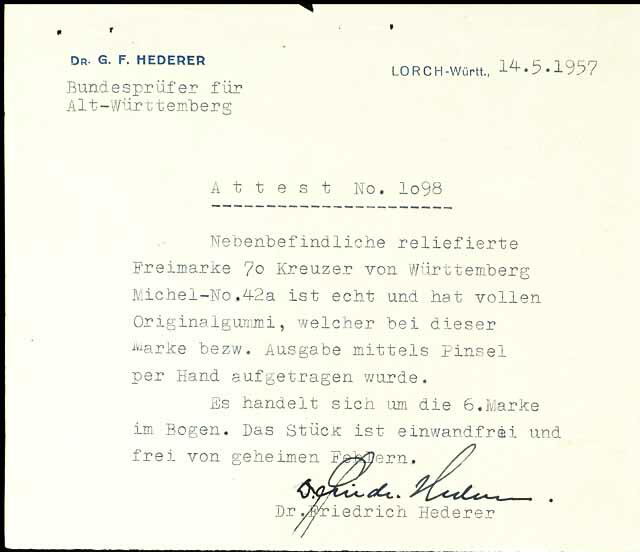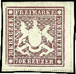 | Zusatzinformationen und Suchstichworte: | Dr. Reinhard Fischer 187. Auktion Auktionstermin: 15. Juli 2022 Los 1347 Altdeutschland Württemberg 70 Kr. braunlila, allseits breitrandig mit zwei vollen Trennungslinien, Bogenfeld 6, tadellos ungebraucht mit Originalgummierung und nur kleinen Anhaftstellen, gepr. Hederer mit Attest, Georg Bühler und Fotoattest Klinkhammer BPP (2022), Mi. 3.800.- - eine sehr seltene Marke in tadelloser Qualität! Ausruf 800,00 EUR |