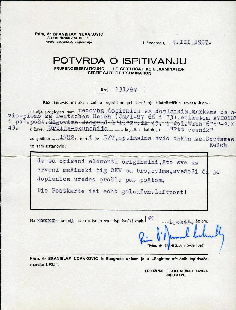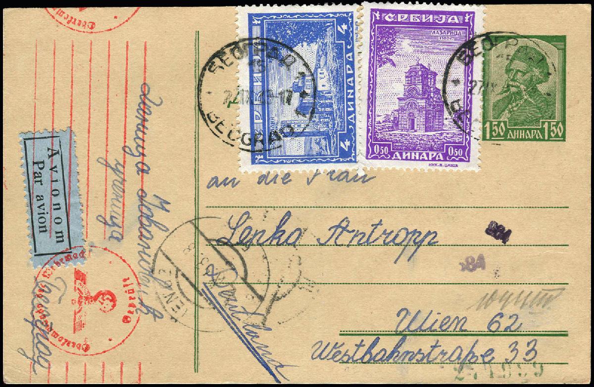 | Zusatzinformationen und Suchstichworte: | Schlegel Online-Shop Los 4409500274 Deutsche Besetzung II. WK Serbien 1943, 1.50 D.- Karte mit Zusatzfrankatur, Klöster 0.50 D. u. 4 D. (Mi-Nr. 71, 78) auf Luftpostkarte mit Zensur aus Belgrad nach Wien, tadellose Qualität, Attest Novakovic Festpreis 120,00 EUR |