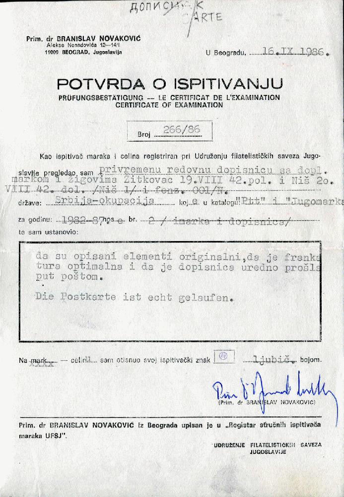 | Prüfgebiet: | Deutsche Besetzung WK 2 Serbien |
