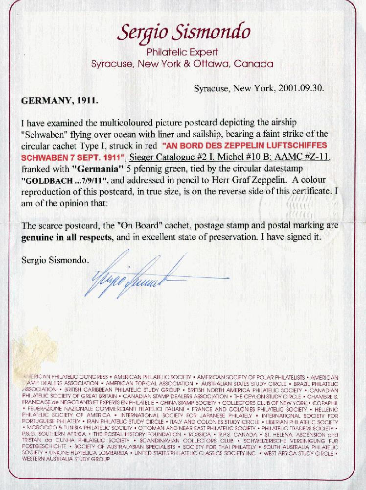 | Zusatzinformationen und Suchstichworte: | Schlegel Online-Shop Los 4431300018 Zeppelin, Zeppelinpost vor WW-I,1911, Luftschiff LZ 10 "SCHWABEN", farbige Karte "Luftfahrten mit Zeppelin-Schiffen" geschrieben an Bord der Schwaben auf einer Rundfahrt über Gotha mit rotem Bordstempel Typ II vom 7.9.1911 entwertet Goldbach 7.9. adressiert an GRAF ZEPPELIN, Friedrichshafen, Attest Sismondo (Sieger 2 I) Festpreis 420,00 EUR |