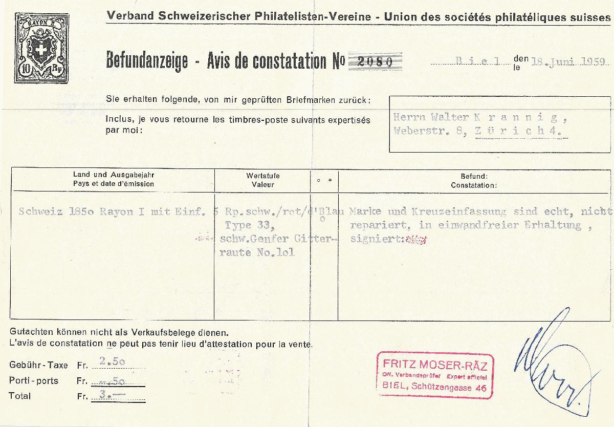 | Prüfer: | Moser-Räz, Fritz (SBPV / ASEP (Schweizerischer Briefmarken-Prüfer-Verband)) |