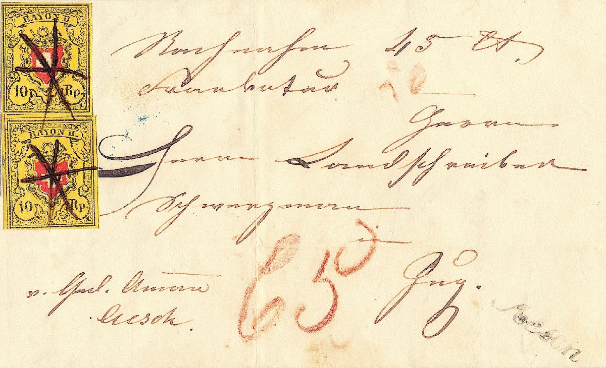 | Zusatzinformationen und Suchstichworte: | Honegger Philatelie AG - Jahresliste 2022 Los 312 Rayon II, gelb, ohne Kreuzeinfassung (STEIN E) Nachnahme geschrieben am 10.06.54 von Aesch LU nach Zug. Dort angekommen am 14.06.53 mit Stein ERO, Typen 2+17 mit einer sehr interessanten und eigenwilligen Tintenentwertung (dreifach gekreuzt). Gute Erhaltung; Befund Marchand Festpreis 690,00 CHF |