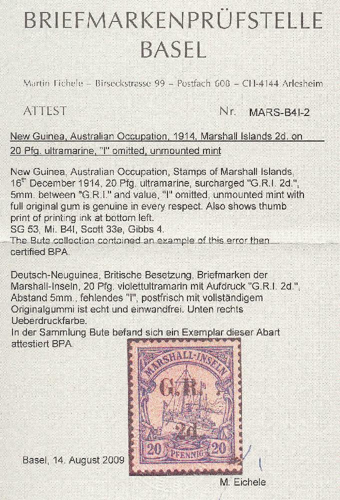 | Zusatzinformationen und Suchstichworte: | 11. classicphil GmbH Auktion Auktionstermin: 28. Mai 2022 Los 1008 Deutsche Kolonien Marshall Brit. Besetzung 1914,2 d. auf 20 Pf. ultramarin, Marshallinseln Briefmarke, mit schwarz G. R. I./2 d. Aufdruck, Abart I ausgelassen nicht notiert in SG, rechte untere Ecke mit Daumenabdruck des Aufdruck Tinte, die Bute Sammlung enthielt 1 Stück dieser Fehler beglaubigt BPA, Zeilen mit 5 mm Abstand, großer Teil Originalgummi, gelistet in Gibbs auf Seite 117 bisher zu sein beglaubigt/Ansatz Scheller ist recommanded, Gibbs 4, Michel B4I, Attest Eichele 2009, hervorragend Rarität, sehr frisch und in perfektem Zustand, CV Mindest £8000, Kabinett! Schätzpreis 9,600 EUR. Zuschlag 1800,00 EUR |