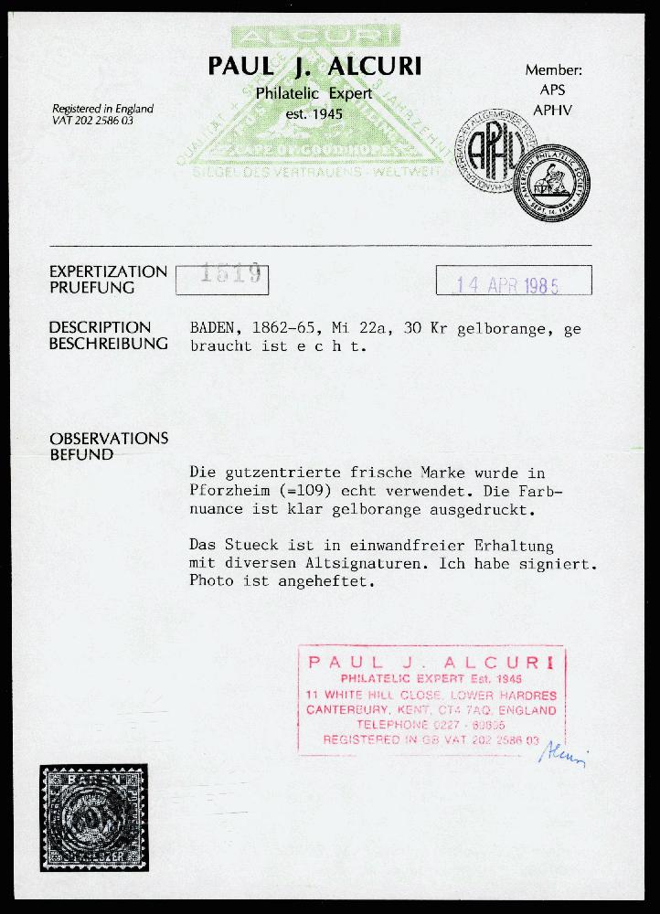 | Zusatzinformationen und Suchstichworte: | Klüttermann - 4. Auktion Auktionstermin: 28. Juli - 5. August 2022 Los 156 Altdeutschland Baden 30 Kreuzer gelborange, Luxusstück mit zentrischem NS 109 Pforzheim, diverse Signaturen und FA Alcuri Katalogwert: 3000 Ausruf 1.000,00 EUR |
