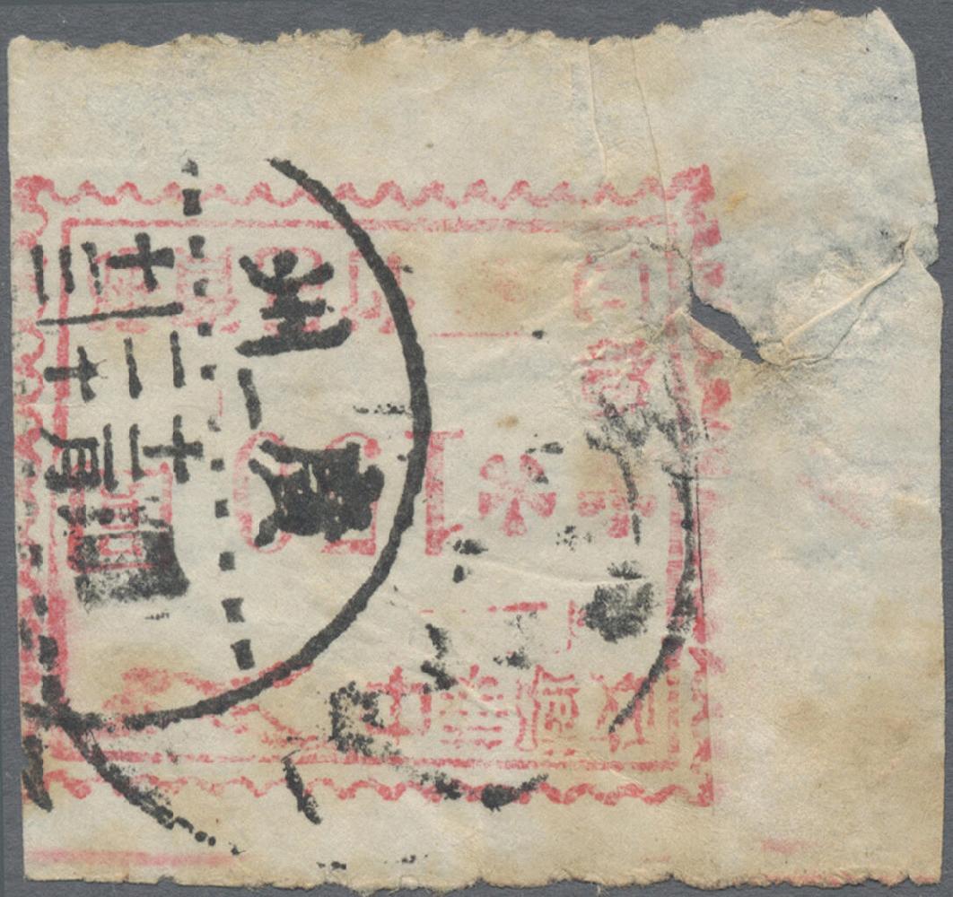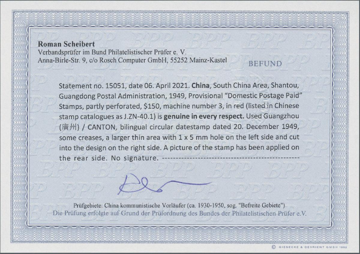 | Zusatzinformationen und Suchstichworte: | Christoph Gärtner 53. Auktion Auktionstermin: 20. - 21. Juni 2022 Los 385 China VR Südchinesischen, Kwantung/Guangdong Postverwaltung, Swatow/Shantou, 1949, provisorisch "Inlandporto gezahlt" Briefmarken, Teil gezähnt $150, Maschinennummer hui 3 in rot, Stempel zweisprachiges "Kanton 1949,12,20" . Ein paar Büge, Teil verdünnt mit 1x 5 mm Loch und Zeichnung teilweise berührt rechts. Attest Scheibert BPP (2021) Zuschlag 250,00 EUR |