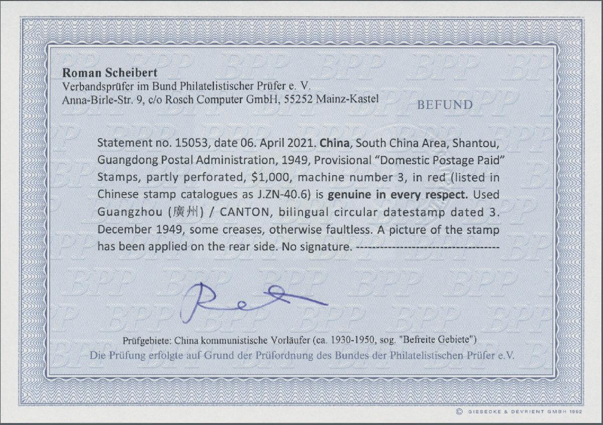| Zusatzinformationen und Suchstichworte: | Christoph Gärtner 53. Auktion Auktionstermin: 20. - 21. Juni 2022 Los 387 China VR Südchinesischen, Kwantung/Guangdong Postverwaltung, Swatow/Shantou, 1949, provisorisch "Inlandporto gezahlt" Briefmarken, Teil gezähnt $1000, Maschinennummer hui 3 in rot, Stempel zweisprachiges "Kanton 1949,12,3" . Ein paar Büge, ansonsten fein. Attest Scheibert BPP (2021) Zuschlag 400,00 EUR |