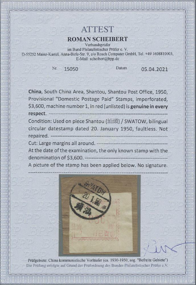 | Zusatzinformationen und Suchstichworte: | Christoph Gärtner 53. Auktion Auktionstermin: 20. - 21. Juni 2022 Los 389 China VR Südchinesischen, Swatow/Shantou Post Office, 1950, provisorisch "Inlandporto gezahlt" Briefmarken, ungezähnt $3600, Maschine shan Nummer 1, in rot, entwertet zweisprachiges "SWATOW 20. 1,50" auf Briefstück. Es ist vorher nicht verzeichnet in China Porto Briefmarkenkataloge. Ein vorgeschlagen Katalog Nummer wollte sein "J. ZN. 44,8" . - dieses ist die Briefmarke gemeldet in "JIYOU" 7/1999 p. 40 als "neu findendem. " es war vorgefunden in Deutschland. Keine anderen Exemplar aufgebunden seit. Die einzig bekannte Briefstücks mit $3600 Stückelung, einmalig. Attest Scheibert BPP (2021). Zuschlag 3.800,00 EUR |