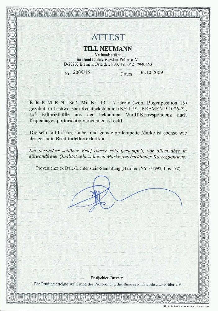 | Zusatzinformationen und Suchstichworte: | Rapp Auktion 2022 Auktionstermin: 2. - 7. Mai 2022 Los 938 Altdeutschland Bremen 7 Gr. schwarz auf gelbem Papier, äusserst frisch und allseitig erstklassig gezähnt, mit übergehendem Rahmenstempel BREMEN 9 10 (1867) auf vollständigem Brief nach Copenhagen. Laut Attest Brettl einer der schönsten bekannten Briefe aus der Wulff-Korrespondenz. Auch das Attest Neumann bestätigt die perfekte Erhaltung dieses äusserst seltenen Briefes. Zuschlag 17.000,00 CHF |
