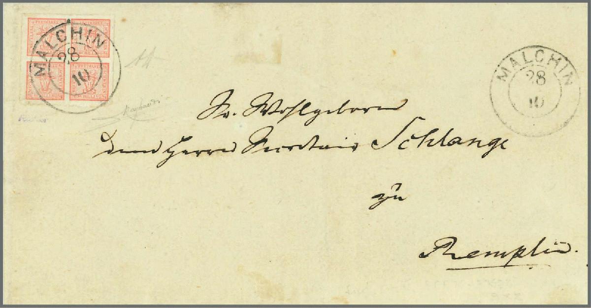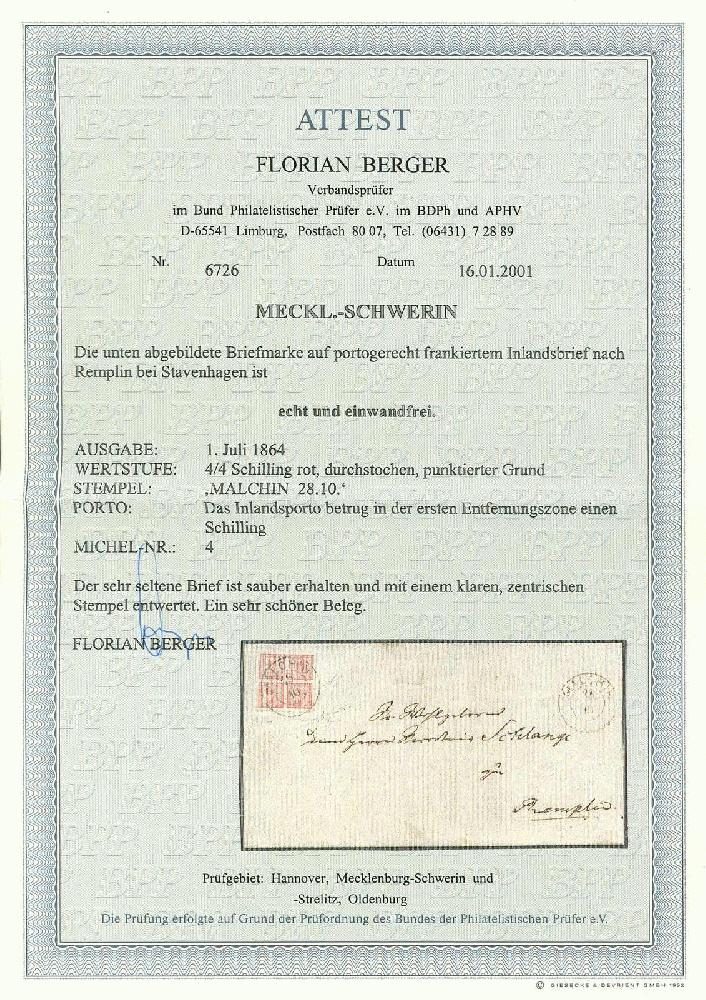| Zusatzinformationen und Suchstichworte: | Rapp Auktion 2022 Auktionstermin: 2. - 7. Mai 2022 Los 947 Altdeutschland Mecklenburg Schwerin 4/4 Sch. rot, punktierter Grund, allseitig perfekter Durchstich, mit klar ausgeprägtem Aufgabestempel MALCHIN 28/10 zentrisch über die Marke und rechts wiederholt auf weissem Brief nach Remplin bei Stavenhagen. Briefe mit perfekt erhaltenen Marken dieser Ausgabe sind sehr selten! Attest Berger BPP. Zuschlag 4.200,00 CHF |