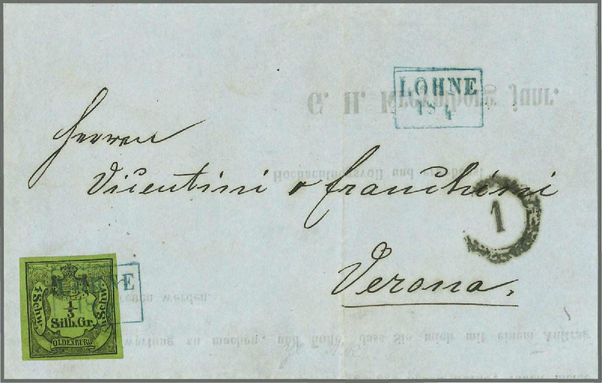 | Zusatzinformationen und Suchstichworte: | Rapp Auktion 2022 Auktionstermin: 2. - 7. Mai 2022 Los 948 Altdeutschland Oldenburg 1/3 Sgr. schwarz auf gelbgrün, breitrandig und sehr frisch mit blauem Aufgabe-Rahmenstempel LOHNE 18 4 (1855) auf vollständiger Drucksache (Vertreterankündigung) nach Verona/Venezien, rückseitig mit Ankunftstempel VERONA 23 4. Portorichtig frankierte Drucksache in das bis 1866 zum Deutsch-Österreichischem Postverein gehörende Venezien. Eine Oldenburg- Rarität ersten Ranges in bester Erhaltung. Laut neuem Attest Stegmüller keine ihm derartige Drucksachen von Oldenburg bekannt. Zuschlag 16.000,00 CHF |